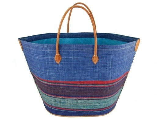 Bardzo duży, kolorowy kosz wykonany z rafii. Wnętrze kosza wyłożone do pewnej wysokości materiałem ze sznureczkiem na brzegach, dzięki czemu kosz można zamknąć. Kosz posiada skórzane rączki. Swobodnie stoi, dzięki płaskiemu denku.