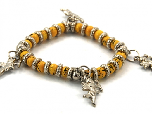 Bransoletka wykonana z żółtych koralików, przekładek w kolorze srebrnym i zawieszek charms w kształcie amora, delfina, ważki, czy kropli wody. Bransoletka wykonana na gumce, dzięki czemu dopasuje się do ręki.