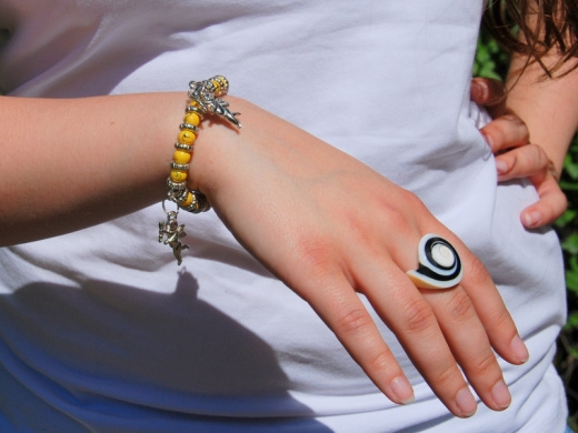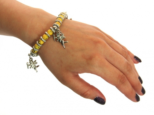 - Bransoletka wykonana z żółtych koralików, przekładek w kolorze srebrnym i zawieszek charms w kształcie amora, delfina, ważki, czy kropli wody.