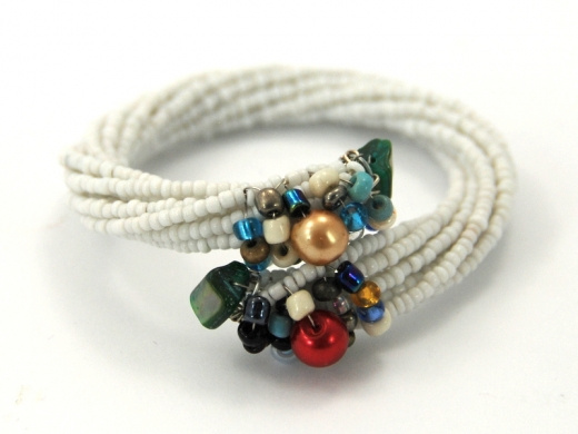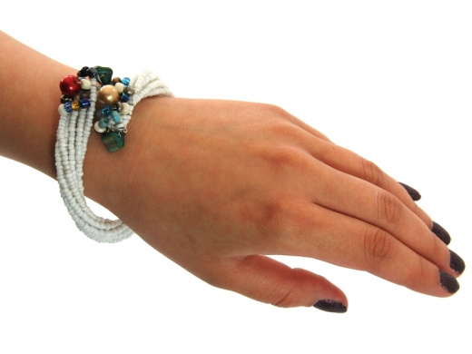 Indyjska bransoletka wykonana z białych koralików, zakończona kolorowymi zdobieniami. Bransoletka otwarta, dzięki czemu idealnie dopasuje się do ręki.