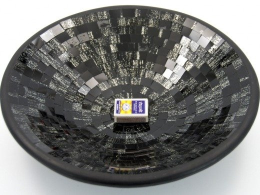 - Masywna misa (patera) wykonana ręcznie z wypalanej gliny pomalowanej na czarno. Powierzchnia patery pokryta została warstwą zdobionych szkiełek.