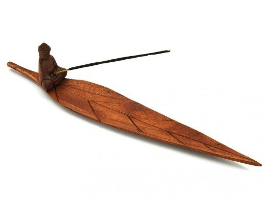 Orientalny stojak na kadzidła z Indonezji. Wykonany z drewna, malowany na brązowy kolor. Przedstawia wizerunek buddy siedzącego na liściu. Posiada otwór na kadzidełko.