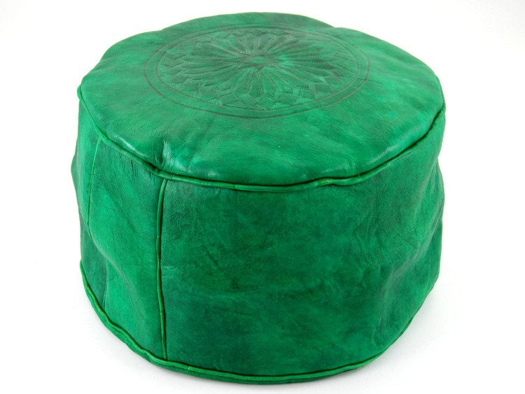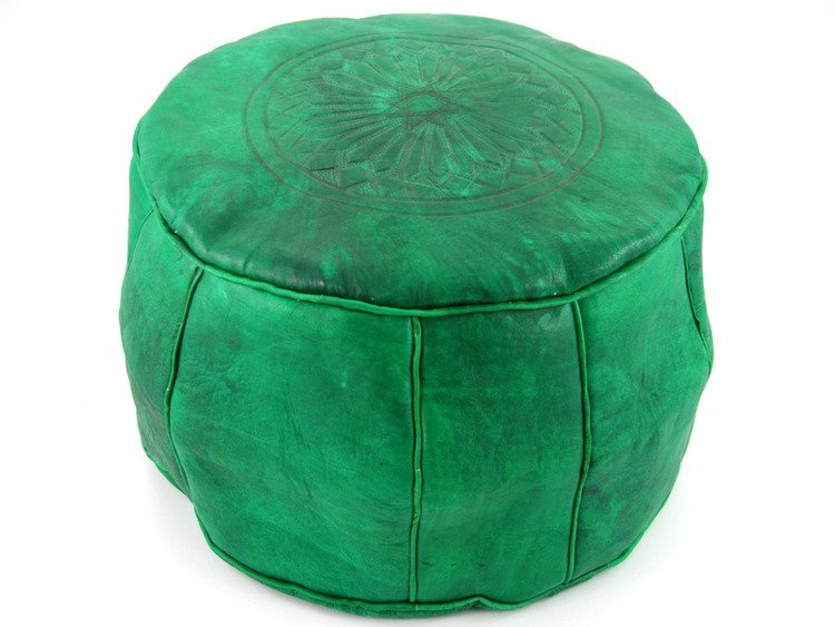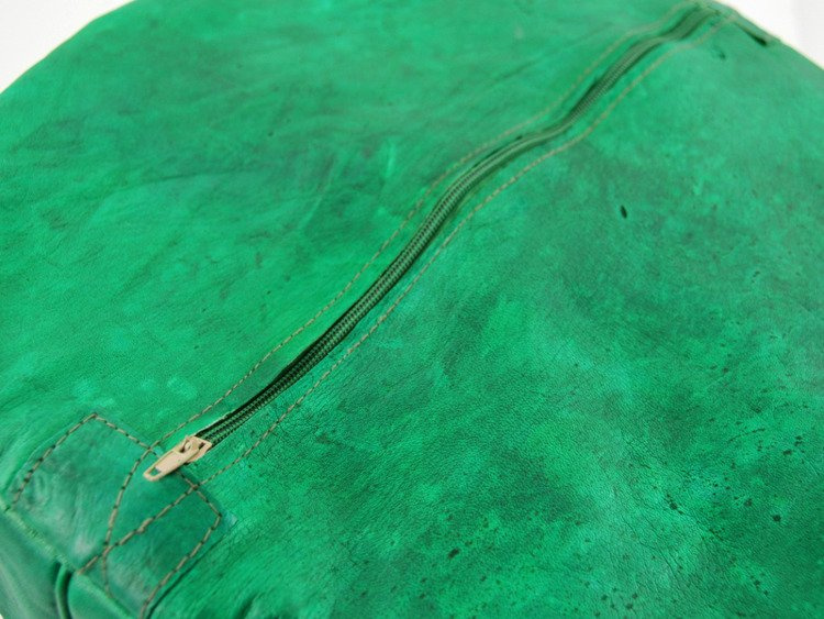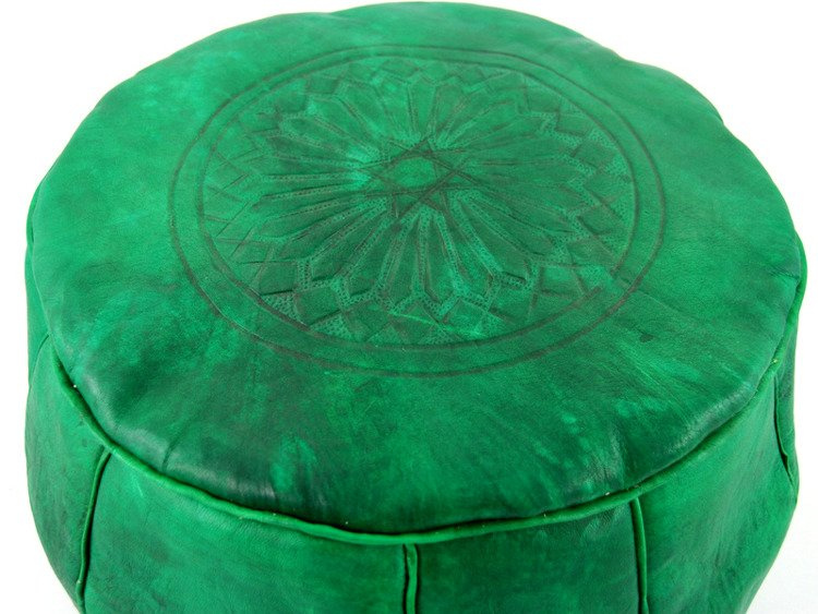 Puf wykonany ręcznie, zakupiony na suku w Maroku. Szyty z ręcznie wyprawianej i barwionej skóry z garbarni w Fezie. W całości wykonany z miękkiej skóry, posiada zdobienia w stylu marokańskim na górnej części siedziska. Wygody zamek u dołu pufy sprawia, że może być ona wypełniona w różny sposób w zależności od upodobań - siedzisko może być bardziej twarde bądź miękkie. Intensywny zielony kolor doda każdemu wnętrzu radości.