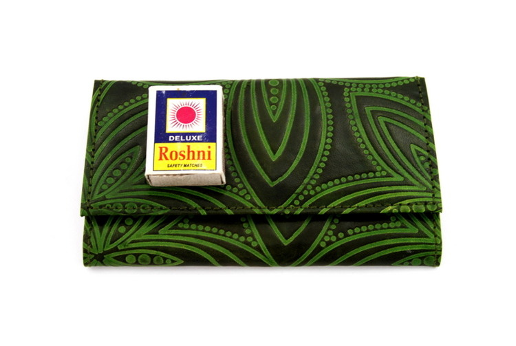 Skórzany portfel - portmonetka w kolorze zielono-czarnym. Zdobiony orientalnymi wzorami wykonanymi metodą tłoczenia. Wyjątkowe rękodzieło prosto z Indii. Wewnątrz posiada cztery kieszonki idealnie pasujące na polskie banknoty oraz zapinane na zamek dwie kieszonki na monety. Posiada również cztery zakładki na kartę oraz zakładke na zdjęcia. Ciekawy pomysł na prezent.