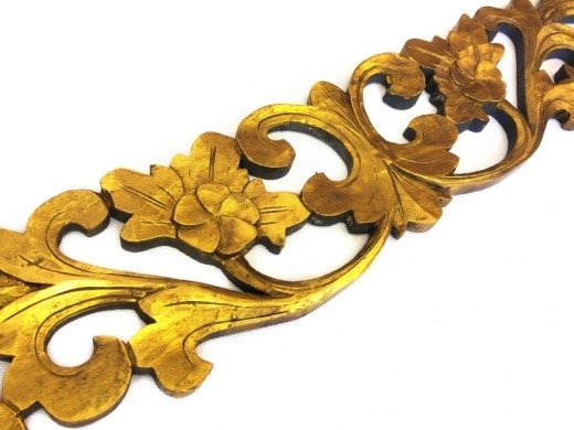 - Rzeźbiony i malowany na kolor złoty duży dekor na ścianę. Rękodzieło z Indonezji wykonane z masywnego drzewa egzotycznego. Posiada haczyk umożliwiający powieszenie. Niepowtarzalny element dekoracyjny.