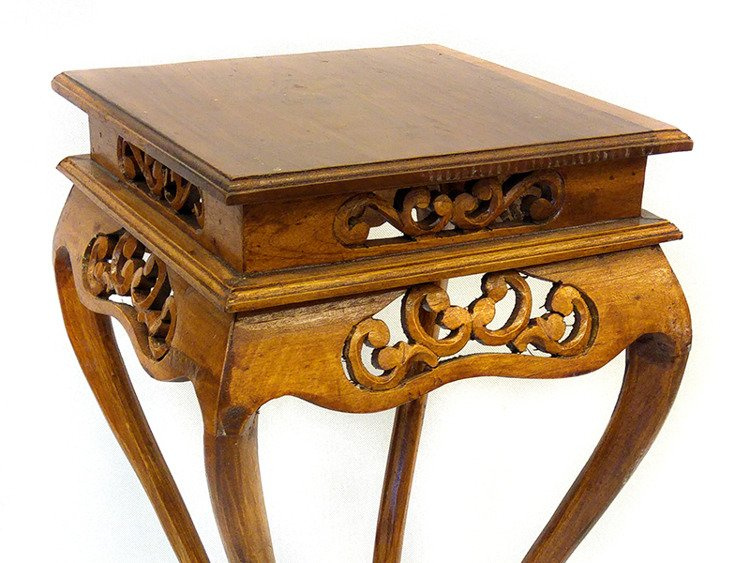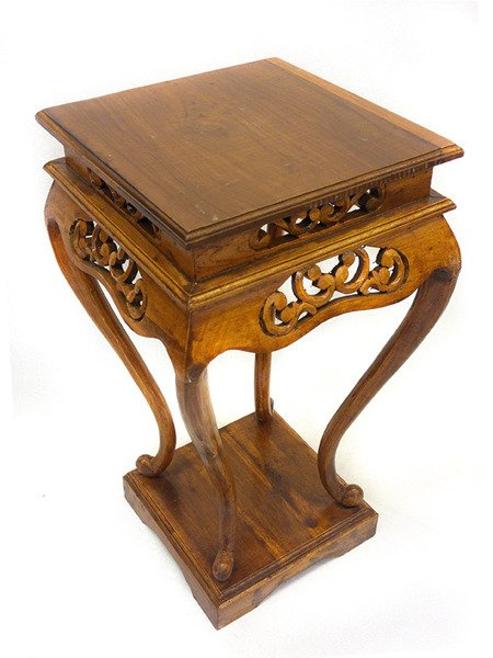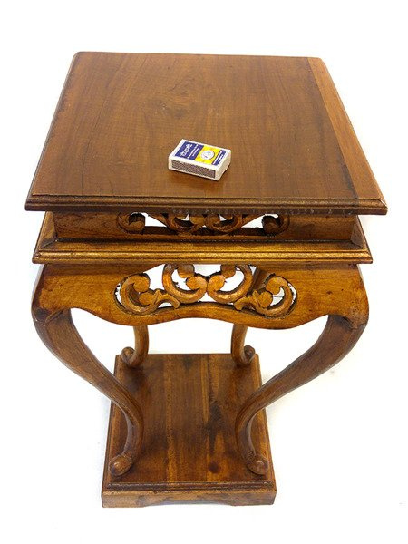 - Orientalny stolik wykonany z drzewa egzotycznego w Indonezji. Górna część pod blatem zdobiona ażurowym wzorem. Całość pomalowana na kolor brązowy. Stolik usytuowany jest na czterech stylowo wygiętych nóżkach na solidnej podstawie. Niewielki,