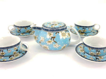 • Chiński serwis do herbaty bądź kawy w skład którego wchodzą czajniczek, 4 filiżanki oraz siteczko do odsączania fusów. Orientalny zestaw ceramiczny w kolorze niebieskim z ozdobnymi aplikacjami kwiatowymi.