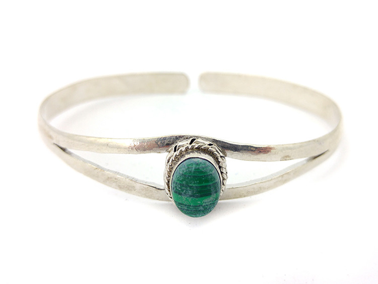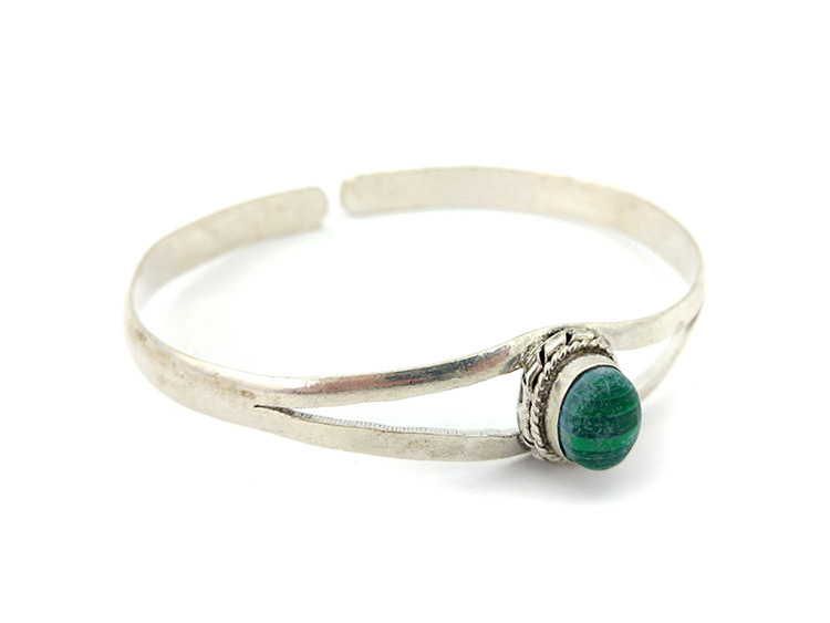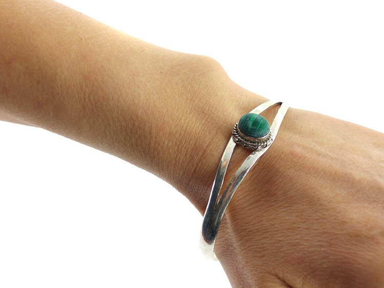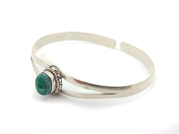 - Przepiękna delikatna bransoletka wykonana ze srebrzystego metalu, ozdobiona zielonym kamieniem. Bardzo ciekawa biżuteria, idelana dla kobiet ceniących niepowtarzalne zdobnictwo i dbałość o detale. Bransoletka jest w rozmiarze uniwersalnym ze względu