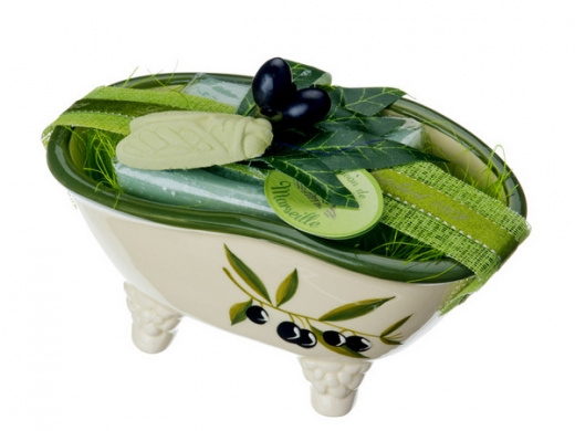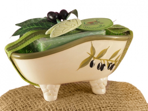 W skład zestawu wchodzi przepięknie zdobiona ceramiczna mydelniczka w kształcie wanienki w stylu shabby chic oraz z oliwkowe mydełko marsylskie. Całość ozdobiona wstążką, figurką prowansalskiego świerszcza oraz gałązką oliwną i jej owocami.