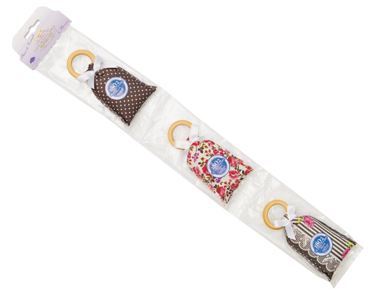 Uszyte z dobrej jakości 100% bawełny, wypełnione aromatycznym prowansalskim suszem lawendowym (18g). Każdy woreczek udekorowany jest kokardką oraz pierścieniem, który umożliwia jego powieszenie np. w szafie na wieszaku.