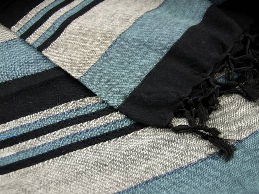 Bawełniana narzuta (kapa) indyjska na łóżko. Dwustronna, posiada pasy w odcieniach koloru czarnego, niebieskiego oraz szarego zakończona frędzlami. Ciekawy element dekoracyjny, wprowadzający orientalny klimat do każdego pomieszczenia.