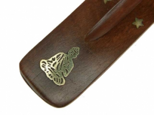 Prosty, delikatny stojak na kadzidła z Nepalu. Wykonany z drewna egzotycznego, z wizerunkiem Buddy, inkrustowany mosiądzem. Posiada zagłębienie na opadający z kadzidełka popiół.