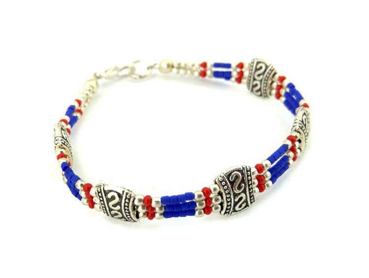 - Oryginalna biżuteria w etnicznym stylu. Przepiękna, delikatna bransoletka z Nepalu, wykonana z koralików w kolorze niebieskim, czerwonym i srebrnym. Zdobiona elementami z tzw. srebra tybetańskiego i naturalnych kamieni. Posiada wygod
