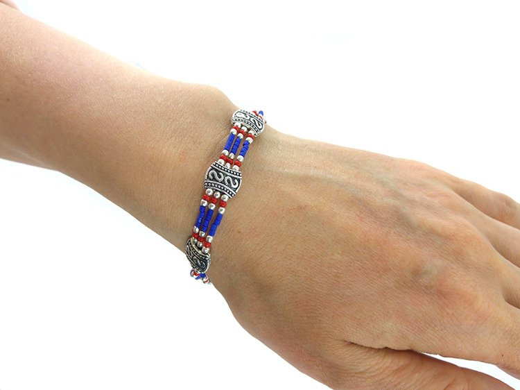 Oryginalna biżuteria w etnicznym stylu. Przepiękna, delikatna bransoletka z Nepalu, wykonana z koralików w kolorze niebieskim, czerwonym i srebrnym. Zdobiona elementami z tzw. srebra tybetańskiego i naturalnych kamieni. Posiada wygodne zapięcie typu "karabińczyk". Bardzo efektowna biżuteria orientalna. Nietuzinkowy dodatek dla kobiet do noszenia zarówno na co dzień jak i na specjalne okazje.