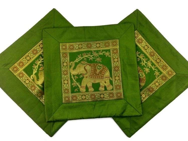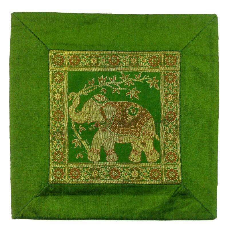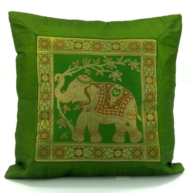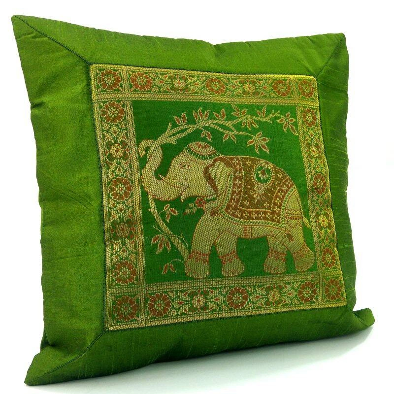 Poszewka w kolorze zielonym ze złotym motywem słonia. Jednostronna zapinana na zamek. Uszyta w Indiach. Oryginalny akcent orientalnej dekoracji w Twoim domu.