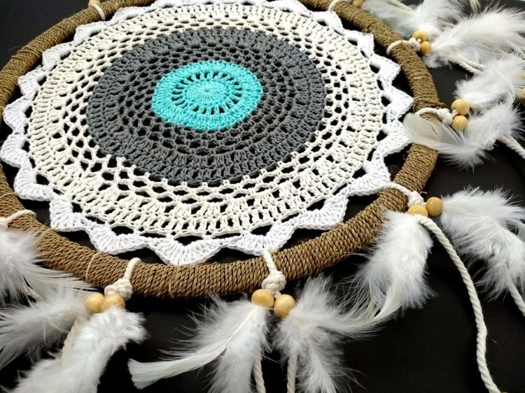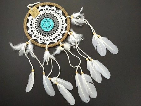 Oryginalne rękodzieło z Indonezji. Przepiękny łapacz snów o średnicy 22 cm, w całości wykonany z naturalnych materiałów. Obręcz wykończona plenionką wiklinową, środek wydziergany bawełnianą koronką w kolorze białym, kremowym, szarym oraz turkusowym. Całość ozdobiona piórkami i drewnianymi koralikami. Piękna orientalna zawieszka do sypialni. Idealna propozycja na prezent na każdą okazję.