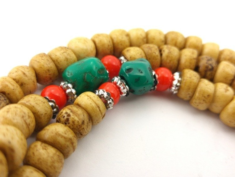 Oferowana mala składa się ze 108 koralików o średnicy 6-8 mm wykonanych z kości naturalnej oraz minerałów. Mala zakończona symboliczną stupą, posiada liczniki oraz znaczniki.
