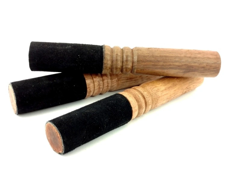 Drewniany patyk do misy grającej ładnie wykończony czarnym zamszowym materiałem.