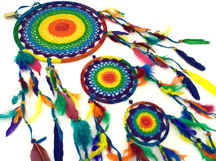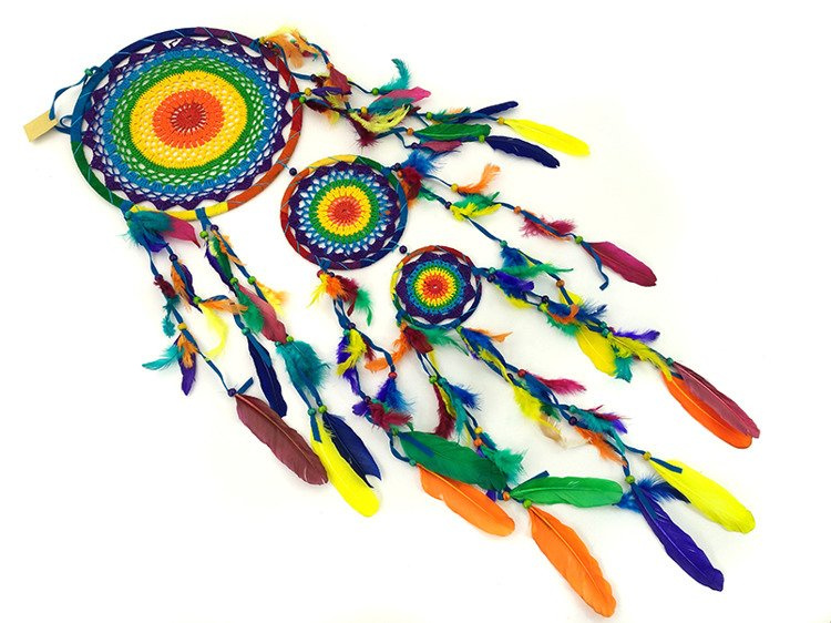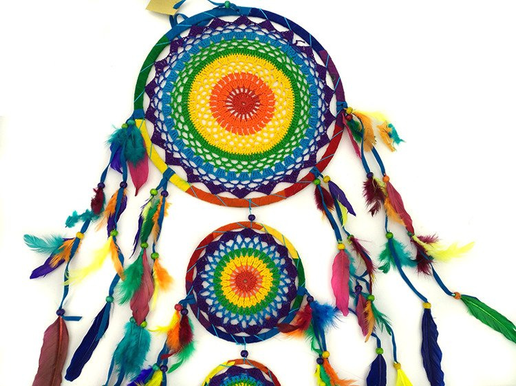 Oryginalne rękodzieło z Indonezji. Przepiękny łapacz snów o średnicy największego koła 32 cm, w całości wykonany z naturalnych materiałów. Obręcze oplecione zamszowym materiałem, środek wydziergany bawełnianą koronką w kolorach siedmiu czakr. Całość ozdobiona piórkami i drewnianymi koralikami. Łapacz w bardzo żywych barwach, odwołujących się do Czakr. Unikatowa i orientalna zawieszka do sypialni. Idealna propozycja na prezent na każdą okazję.