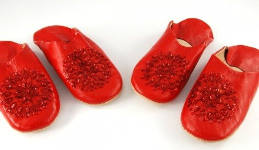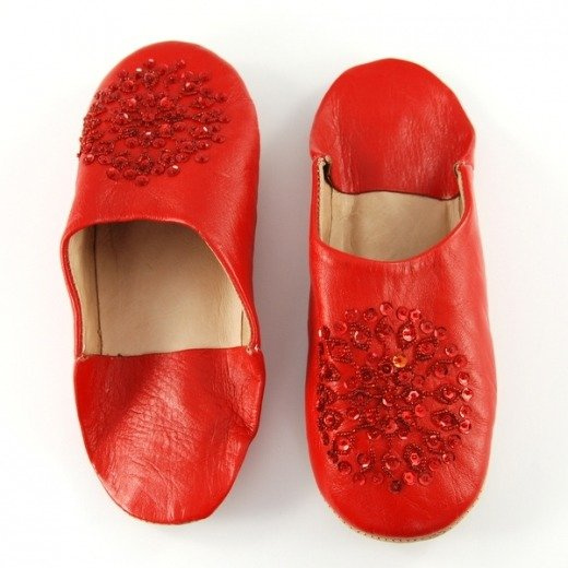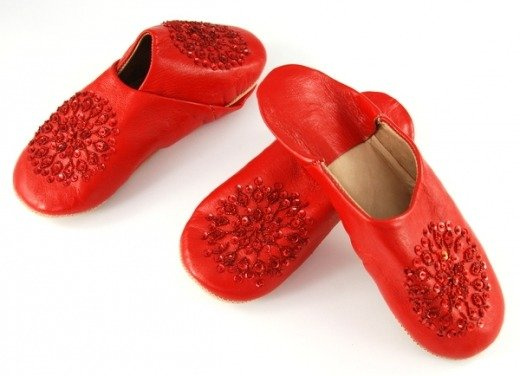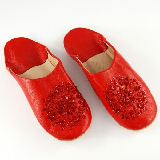 Marokańskie babusze wykonane z miękkiej i delikatnej skóry wyprawianej w garbiarniach Fezu. Buty wyjątkowo wygodne, funkcjonalne; ze zgrabnie zaokrąglonym czubkiem. Ich wierzchnią stronę zdobi piękny owalny wzór wykonany z cekinów i maleńkich koralików.