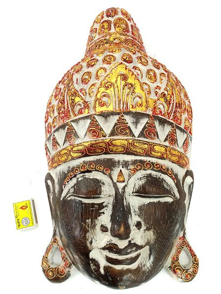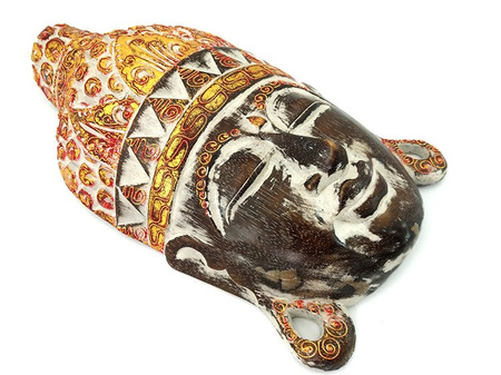 Majestatyczna maska głowy Buddy wykonana ręcznie z drzewa egzotycznego. Rzeźba ma piękną ozdobę na czole i delikatne zdobione rysy na twarzy. Wypukłość na głowie-zgodnie z wierzeniami – symbolizuje moc ducha i przywiązanie do ciała, a długie uszy przypominają o szlachetnym urodzeniu Buddy. Posiada mocowanie umożliwiające zawieszenie na ścianie.