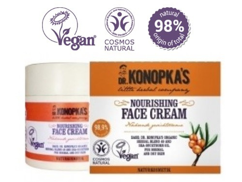 - Odżywczy krem do twarzy Dr. Konopka's dla cery suchej zawiera ekstrakt Nr 49 oraz Nr 54 Dr. Konopki oraz olejek rokitnikowy.