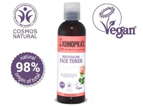 Nawilżający tonik do twarzy Dr. Konopka's dla cery suchej i wrażliwej na bazie organicznego ekstraktu z rumianku, zawiera mineralne składniki odżywcze i bisabolol o działaniu antyseptycznym, uspokajającym i wygładzającym skórę twarzy. Formuła zawiera także organiczną wodę różaną, która delikatnie oczyszcza i przywraca równowagę nawilżenia, widocznie zmiękczając i wygładzając skórę. W składzie znajduje się też wyciąg z nostrzyka, poprawiający krążenie i zmniejszający obrzęki - skutecznie wycisza i uspokaja skórę. Podobne działanie ma ekstrakt z fiołka wonnego, który jest bogaty we flawonoidy i śluzy.