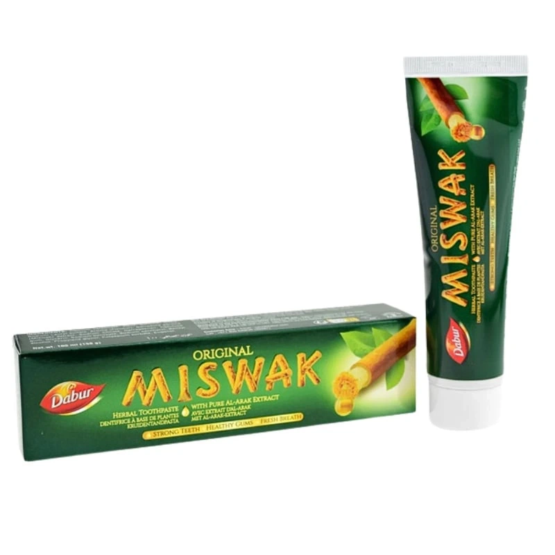 Pasta do zębów Dabur Miswak Herbal to specjalnie przygotowana mikstura z czystym ekstraktem z Meswak – słynnego drzewa mającego właściwości czyszczące oraz dobroczynny wpływ na zęby i jamę ustną. Antybakteryjne właściwości Miswak pomagają w zapobieganiu próchnicy, powstawaniu płytki nazębnej, chorobom dziąseł  i innym chorobom jamy ustnej. Eliminuje nieprzyjemny zapach, odświeża i utrzymuje zęby w zdrowiu.