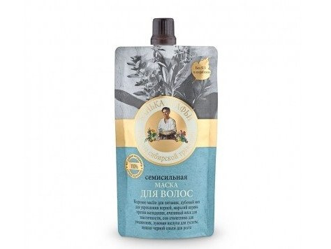 Maska do włosów 7 sił babci Agafii nawilża i odżywia włosy i skórę głowy. Zawarte w masce semisilnaja naturalne zioła zapewniają włosom nawilżenie oraz dostarczają witamin, mikroelementów, aminokwasy. Maska do włosów siedem sił wzmacnia korzenie włosów, stymuluje wzrost włosów, tonizuje skórę głowy, regeneruje uszkodzoną strukturę włosów, zapobiega wypadaniu włosów, wzmacnia włosy nadając im zdrowy wygląd i blask. W skład maski wchodzi: olej cedrowy, mech dębowy, szyszki czarnej olchy, wosk pszczeli, korzeń Szczodraka krokoszowego, sok aloe vera, łupiny cebuli. Maska nie obciąża włosów, nadaje im blask i uczucie świeżości.