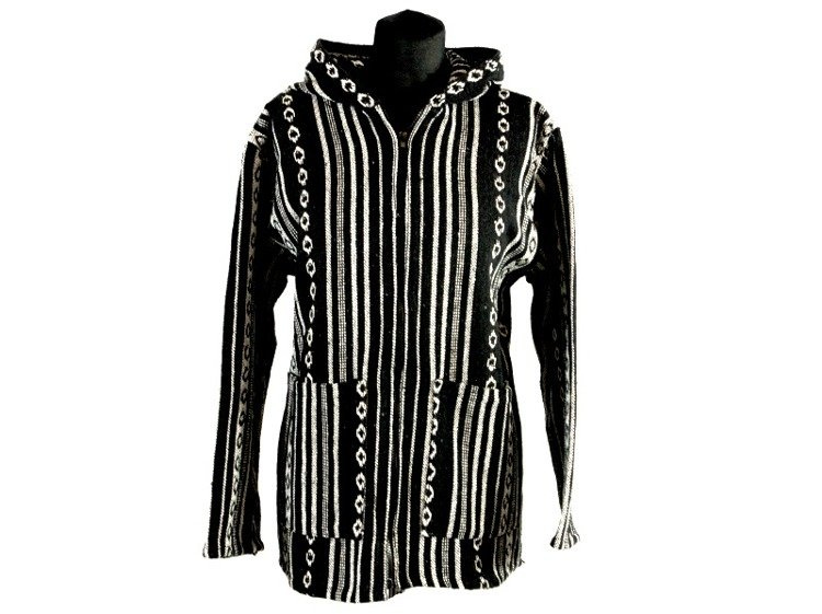 - Dłuższa, lekka i praktyczna kurtka unisex w indiańskie, azteckie wzory. Ubranie w kolorystyce czarno-białej,tkanina pleciona.