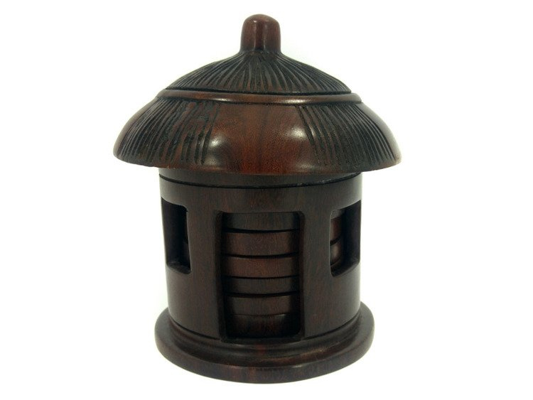 • 6 drewnianych podkładkek pod kubki ukrytych w malowniczym domku afrykańskim. Wykonane z masywnego drewna egzotycznego
