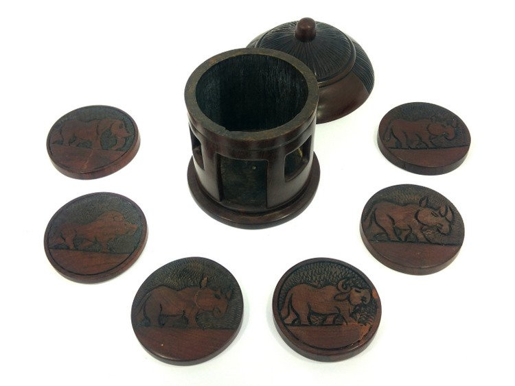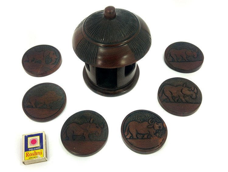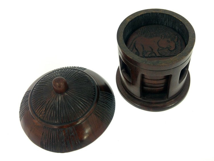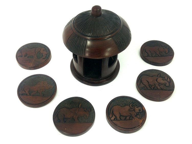 6 drewnianych podkładek pod kubki ukrytych w malowniczym domku afrykańskim. Wykonane z masywnego drewna egzotycznego, ręcznie rzeźbione motywami animistycznymi przez lokalnego artystę.