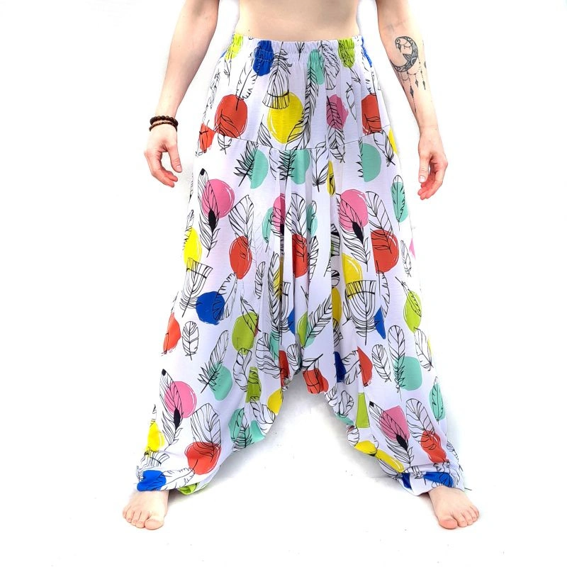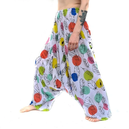 • Orientalne, luźne spodnie -  szarawary z wąską gumką, wykonane z przewiewnego kolorowego materiału, w uniwersalnym rozmiarze.