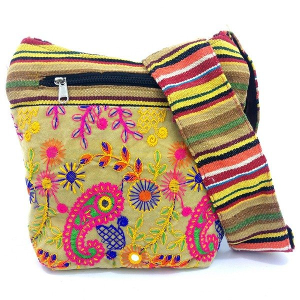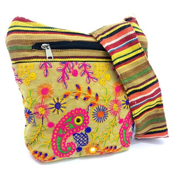 INDYJSKA TOREBKA WOREK NA RAMIĘ BEŻOWA (WYSZYWANA, BAWEŁNA)