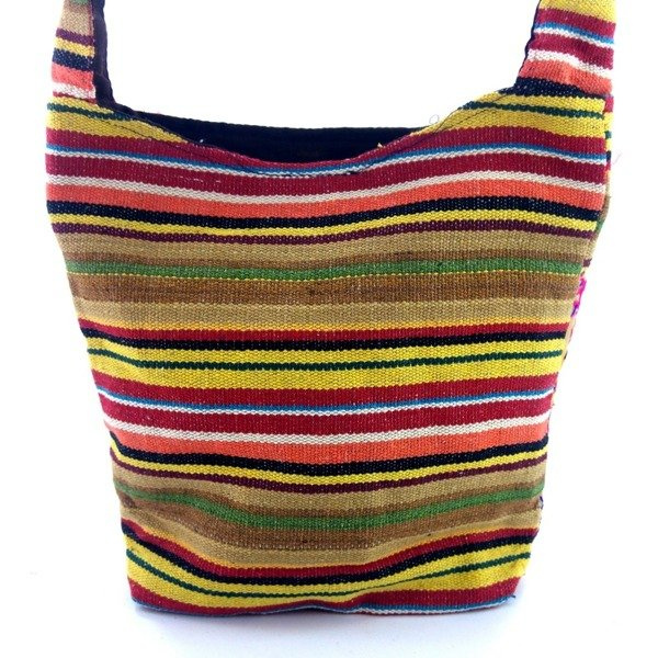 Torebka w kolorowe pasy, wyszywana w piękne kwiatowe wzory. Zdobiona drobnymi lustrzanymi elementami. Wykonana z bawełnianego płótna, z szerokim wygodnym paskiem na ramię.