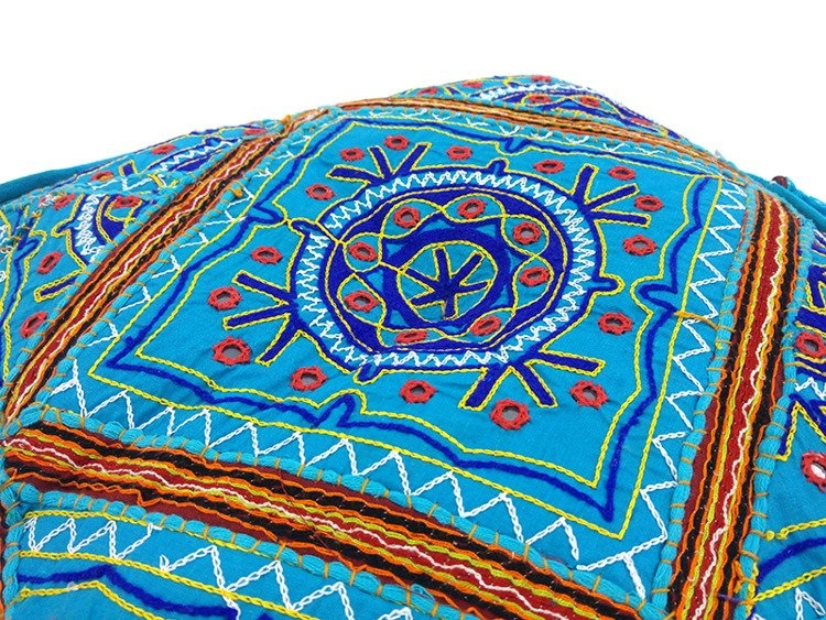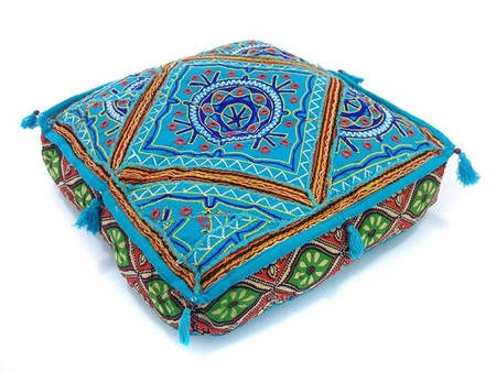 Indyjska pufa ręcznie haftowanych i bogato zdobiona szkiełkami, a po bokach niewielkimi, kolorowymi frędzelkami. Pufa zapinana od spodu na zamek. Może służyć jako wygodne miejsce do siedzenia, orientalna ozdoba. Jest to wygodny i funkcjonalny przedmiot nadający każdemu wnętrzu etnicznego klimatu.