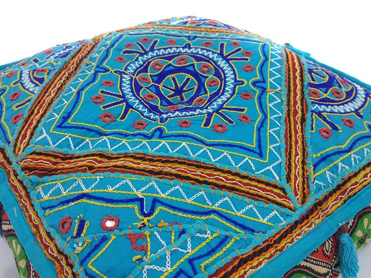 - Indyjska pufa ręcznie haftowanych i bogato zdobiona szkiełkami, a po bokach niewielkimi, kolorowymi frędzelkami. Pufa zapinana od spodu na zamek.