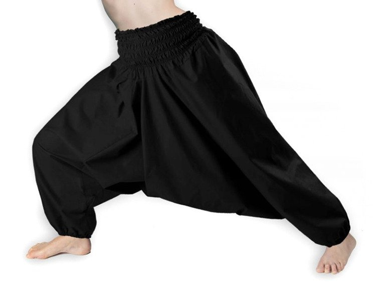 Orientalne, luźne spodnie -  szarawary z szeroką gumką, wykonane z materiału w kolorze czarnym, w uniwersalnym rozmiarze.
