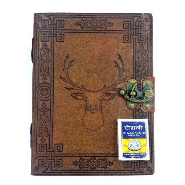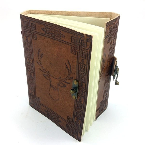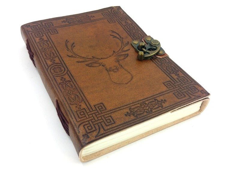 - Notatnik w skórzanej oprawie z metalowym zapięciem.