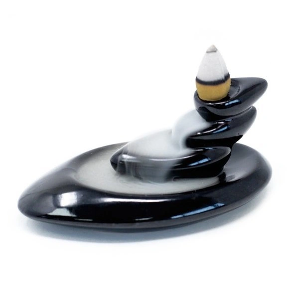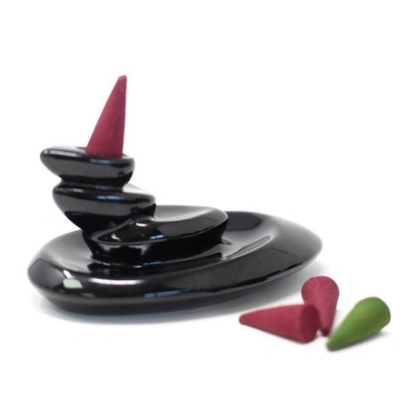 Piękny, ceramiczny kominek z przepływem zwrotnym na kadzidła stożkowe, wykonany z ceramiki. Podstawka ta ma kształt stosu kamieni.
