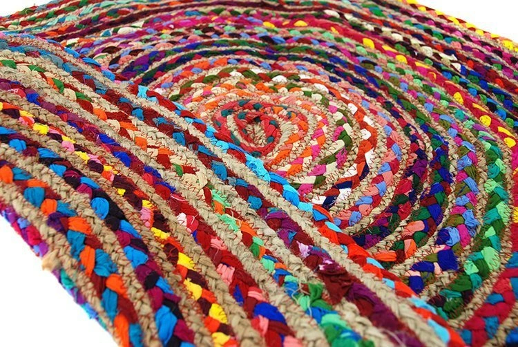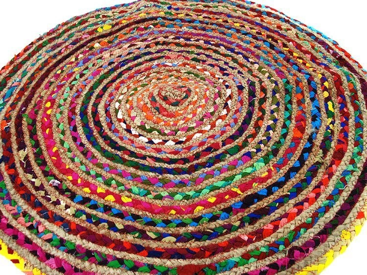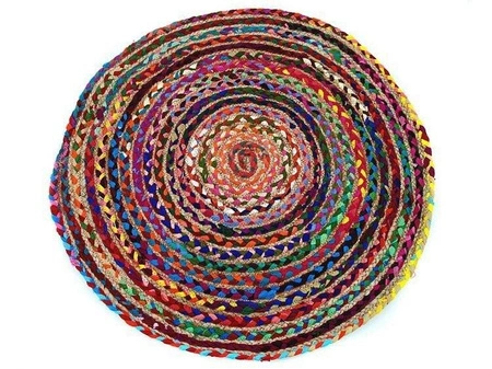- Orientalny, okrągły dywan wykonany metodą patchworku. Może on stać się świetnym dopełnieniem np: salonu, tarasu czy przedpokoju. Naturalne niedoskonałości oraz surowe wykończenie dodają mu uroku.