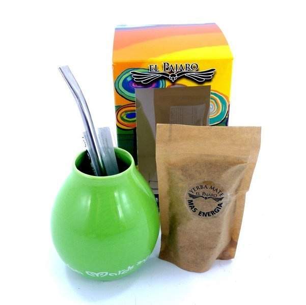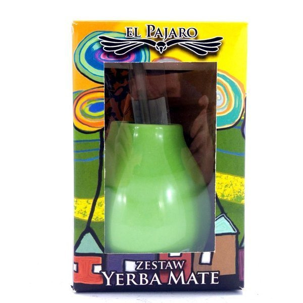 Zestaw do yerba mate składający się z yerby El Pajaro Mas Energia 40 gramów, bombilli Mercedes oraz zielonego matero ceramicznego. Zestaw zapakowany jest w ozdobne pudełko.