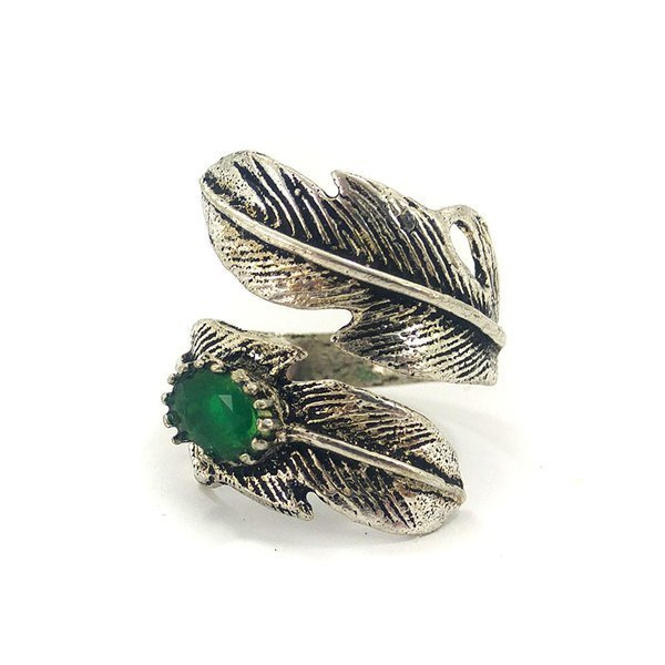 - Elegancki pierścionek zdobiony zielonym szkiełkiem i motywem liścia/pióra wykonany w Indiach.