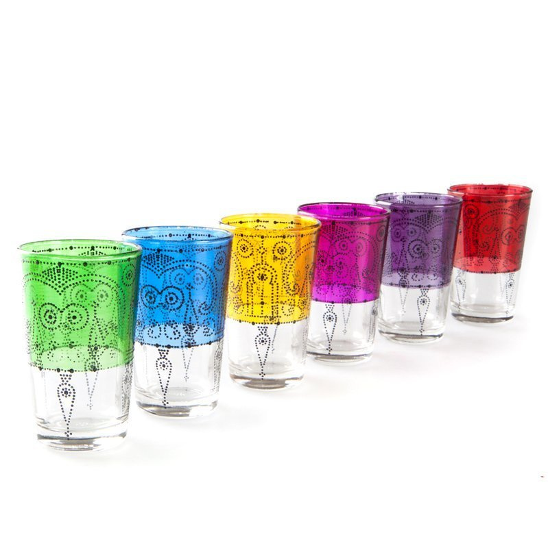 - Komplet sześciu oryginalnych marokańskich szklaneczek. Szklaneczki wykończone ręcznie czarnymi zdobieniami.