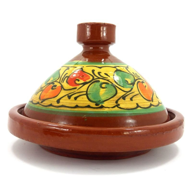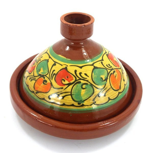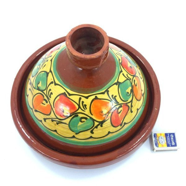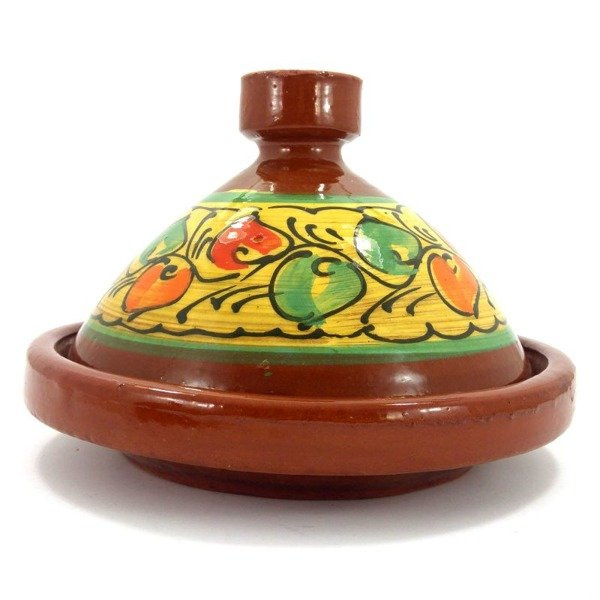 Prezentowany w sklepie tagine posiada zdobienia w marokańskim stylu , jest prostym i surowym typowo użytkowym ręcznie wykonanym glinianym naczyniem.