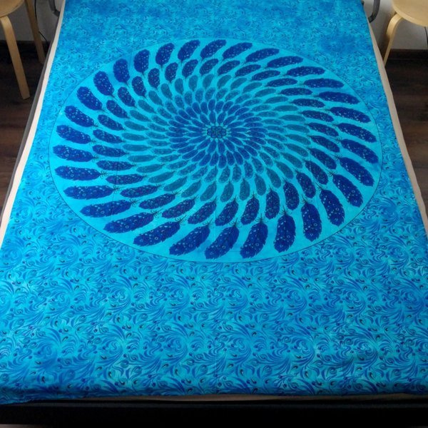 Narzuta z Indii w kolorze niebieskim. Jej główny motyw to mandala z piór.
