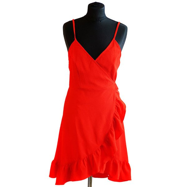 - Sukienka kopertowa, na ramiączkach, z romantyczną falbaną.