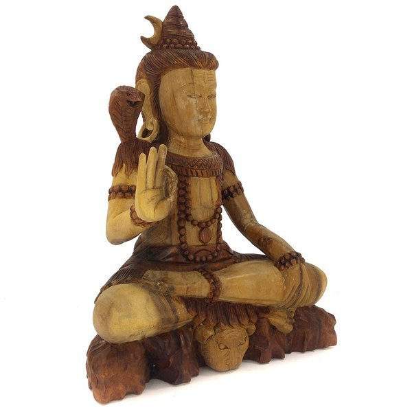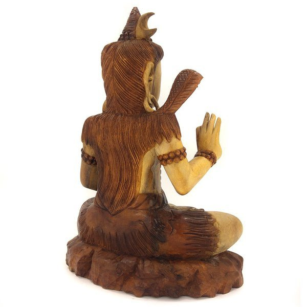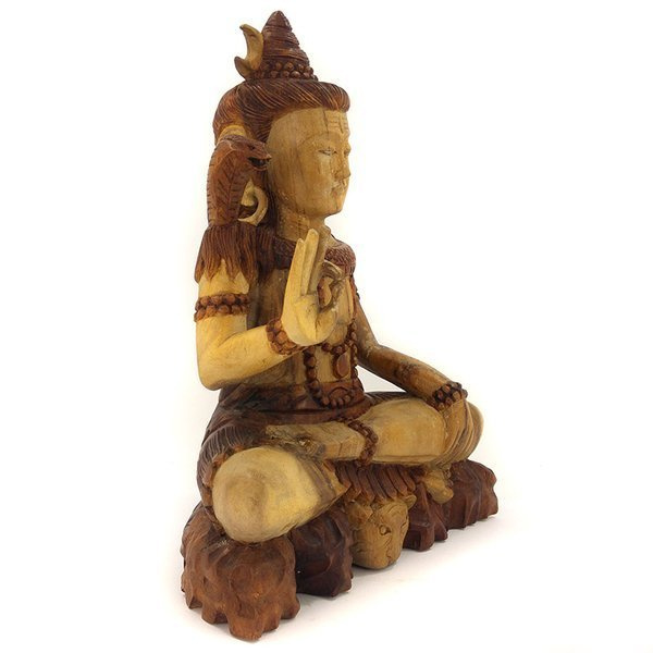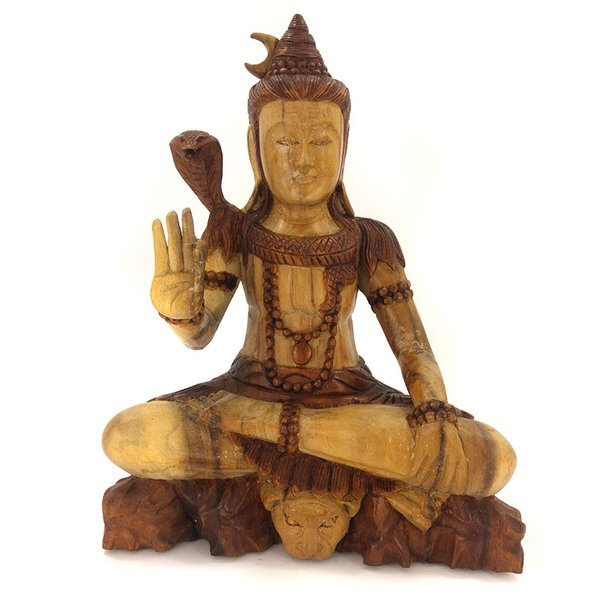 Figurka przedstawiająca bóstwo Shiva wykonana ręcznie z egzotycznego drewna, miejscami barwiona. Śiwa ma wokół szyi oplecionego węża, we włosach umieszczony sierp księżyca, siedzi na skórze zwierzęcia.