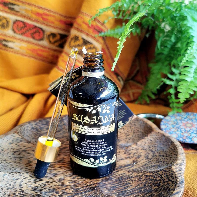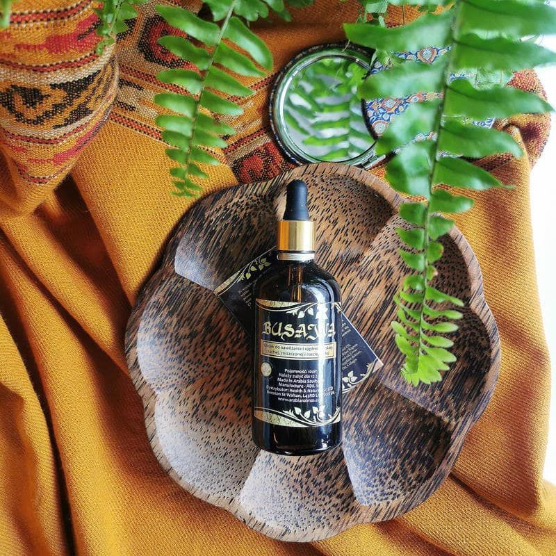 Saudyjki stosują olejek po urodzeniu dziecka by skóra szybko wróciła do ładnego wyglądu, bezpośrednio na skórę zamiast kremu aby skóra szczególnie na twarzy nie była wysuszona i długo zachowała piękny wygląd. Saudyjki nie stosują takiej ilości kosmetyków jak stosują kobiety w Europie wybierając tylko te, które mają za zadanie konkretnie wpłynąć na skórę twarzy, ciała i włosy. Są to kremy o dużej ilości olejów oraz odpowiednio skomponowane oleje, jak i kosmetyki ze złotem (czystym). Olejek Busajna w szybki sposób poprawia wygląd skóry i odbudowuje komórki.