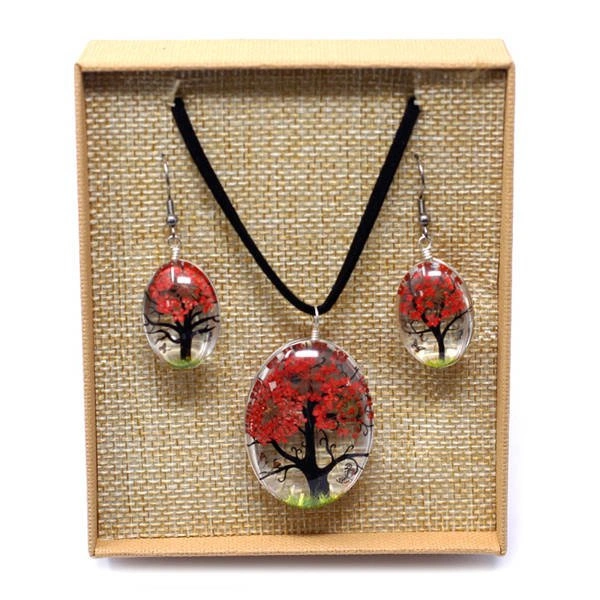 Biżuteria zawiera zatopione w szkle sprasowane kwiaty, na malunku drzewa. Kwiaty są w koralowym kolorze.